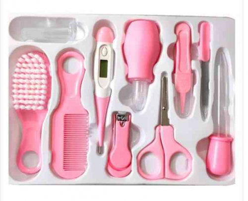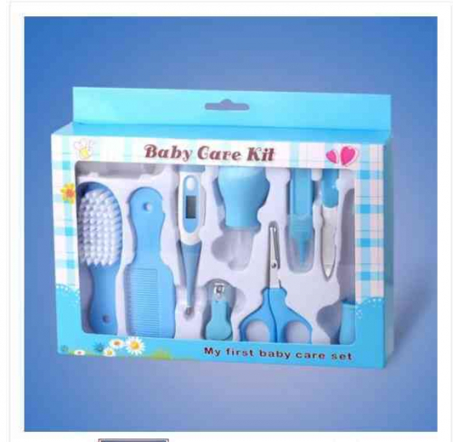 This kit set is designed with a digital thermometer, nose cleaner, nail clipper, nail file, dropper, comb, hair brush, hair-cutting scissors, and finger toothbrush. This 10-piece baby care set includes everything you need to care for and groom your baby, which is essential for babies. It includes a tongue cleaner or finger toothbrush to clean the baby's tongue and teeth
